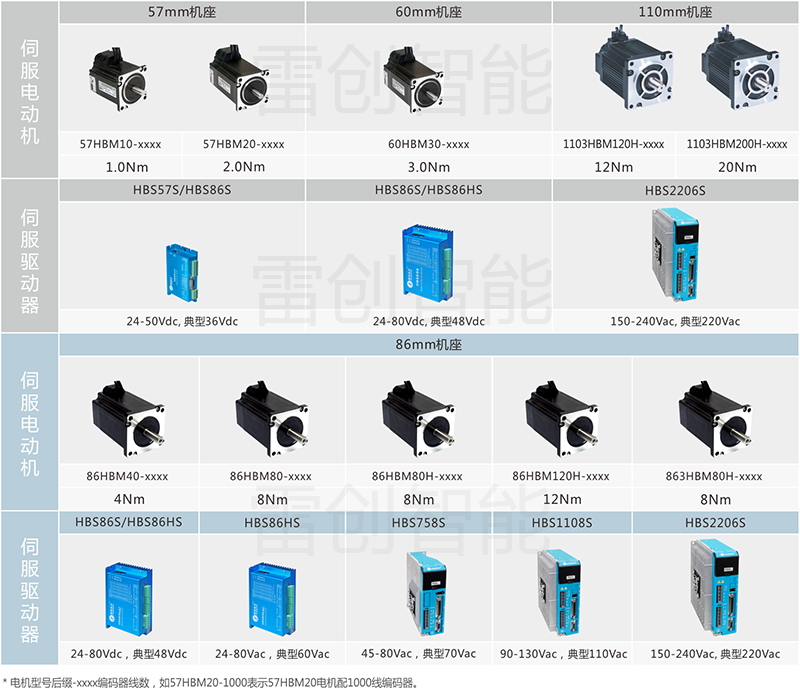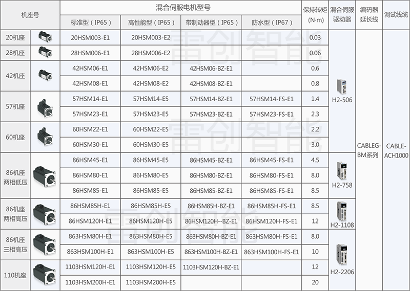 下面提供通用的混合伺服产品选型和配套信息以供参考;特殊应用的优化选型请咨询雷创智能工程师。